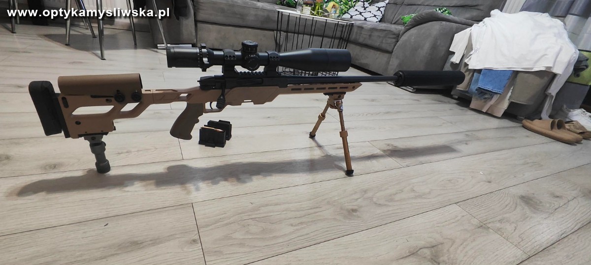 Kupiony w kwietniu 2025 r. Zastosowania: LR / trening oraz polowania — uniwersalny i bardzo precyzyjny zestaw. Do karabinu zamontowana jest ceniona luneta Vector Optics Continental 5–30×56 FFP (SFP/30, tubus 34 mm). W zestawie również tłumik STALON XE149, znacząco redukujący odrzut i hałas. W komplecie dwójnóg, monopod i poziomniczka (widoczne na zdjęciach).
